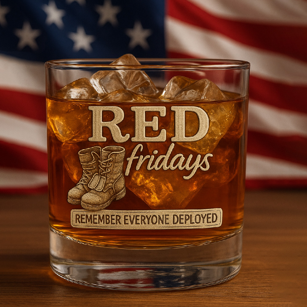 🥃Show your pride and gratitude for those who serve with our RED Fridays “Remember Everyone Deployed” Whiskey Glass.